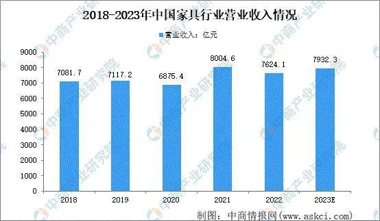 數(shù)據(jù)顯示,2022年受疫情和外貿(mào)等因素影響,我國家具行業(yè)規(guī)模以上企業(yè)實現(xiàn)營業(yè)務收入7624.1億元,同比下降-4.8%。回顧2018-2022年家具制造業(yè)營業(yè)收入情況:近年來,我國家具制造業(yè)營業(yè)收入總體呈小幅度下降趨勢,預計2023年我國家具行業(yè)復蘇營業(yè)收入將達7932.3億元。