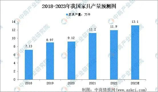 作為全球家具生產(chǎn)中心,早在2006年中國家具產(chǎn)業(yè)產(chǎn)值已躍居世界第一位,中國已然成為世界家具生產(chǎn)、消費及出口大國。2022年我國家具業(yè)產(chǎn)量11.9萬件,同比增長5.9%。預計2023年我國家具行業(yè)產(chǎn)量將達13.1萬件,同比增長10.05%。
