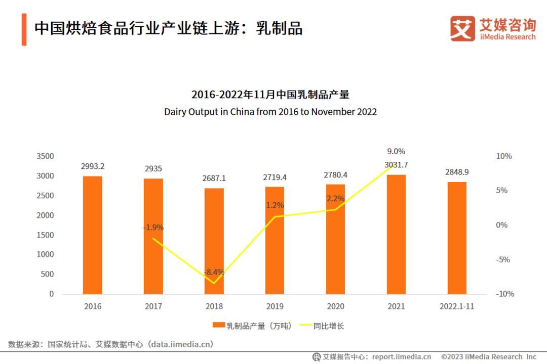 中國烘焙食品行業產業鏈上游:乳制品,數據來源:艾媒數據中心