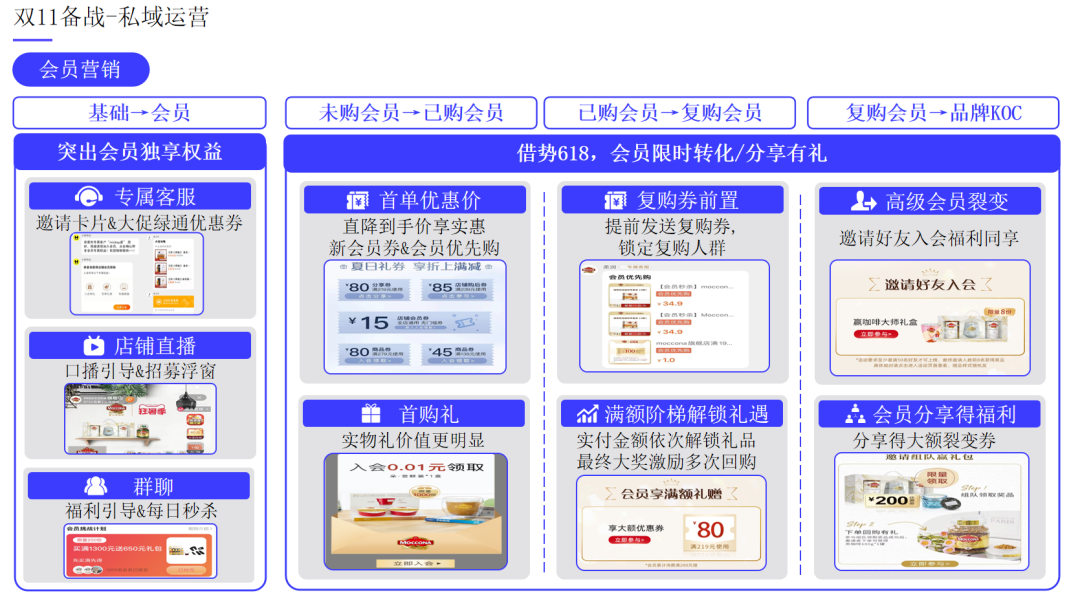再有,不斷升級會員,從基礎(chǔ)訪客到一般會員,從未購會員、已購會員再到復(fù)購會員,進而裂變?yōu)槠放芀OC(關(guān)鍵意見領(lǐng)袖),會員們享受不同的特色服務(wù)與大額折扣,重視自身會員地位,加深品牌歸屬感。