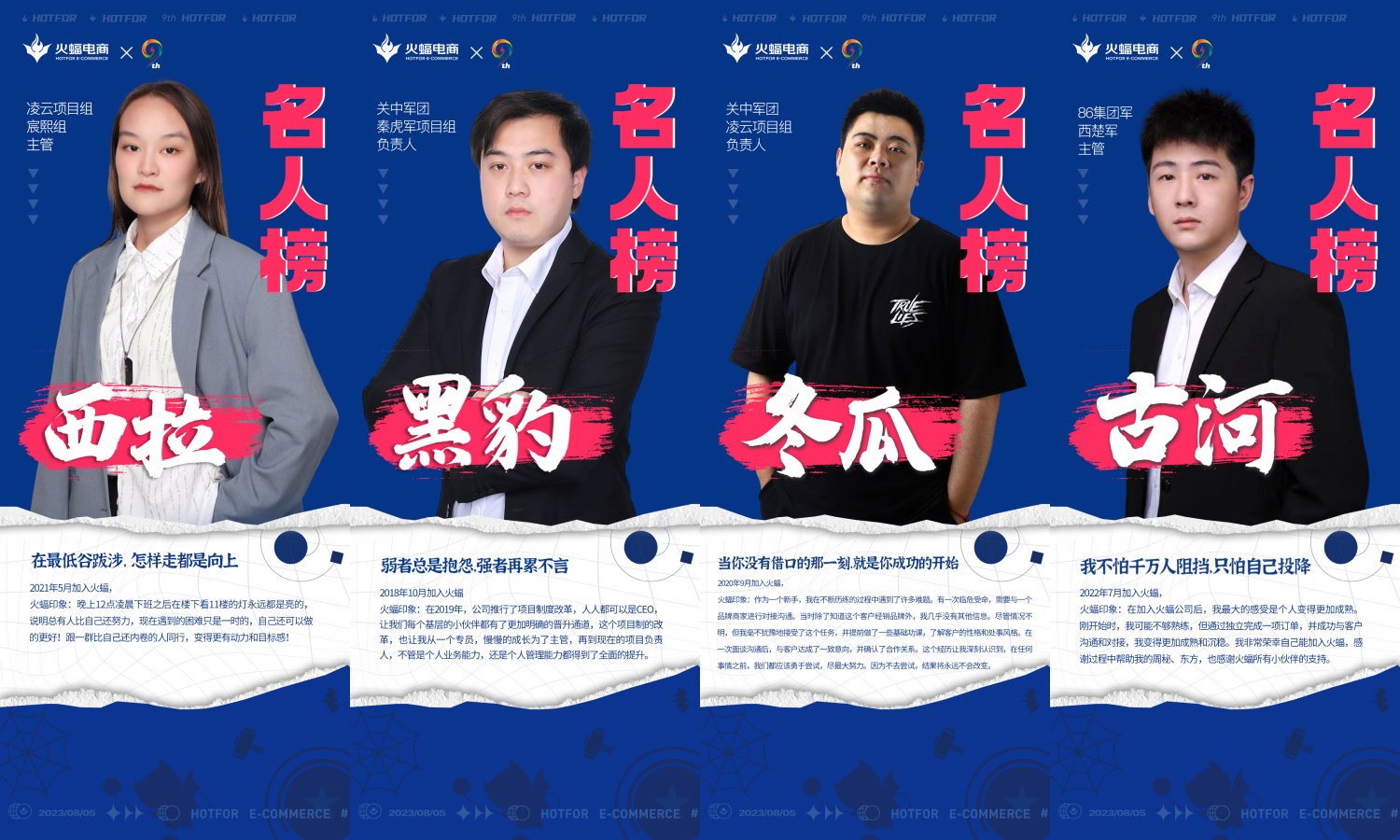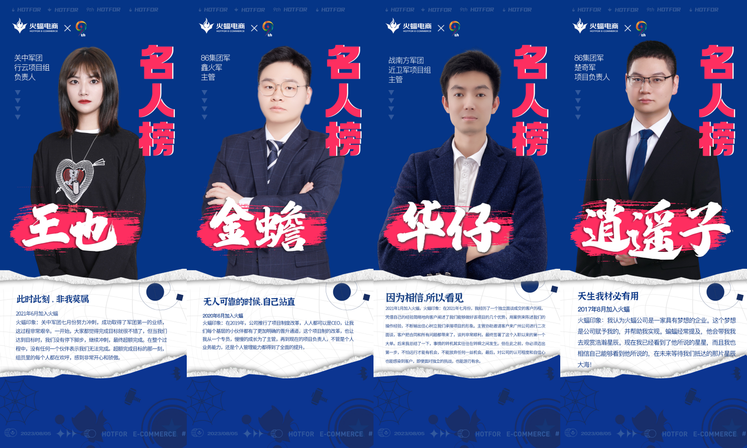 在9周年慶典上,鐘雨清先生特別強調:“組織經(jīng)營就是人才經(jīng)營,與誰同行決定了公司的發(fā)展方向,火蝠需要的是一群‘尚樸實,耐苦勞’,有共同信仰為之不懈奮斗的‘戰(zhàn)友’。因為在不同的階段,挫折是成功必不可少的經(jīng)歷,是開創(chuàng)偉大事業(yè)的必經(jīng)之路,同時這也是檢驗團隊最好的方式,只有戰(zhàn)友才能陪伴火蝠度過暗夜。”他要求一線負責人、主管、軍團長牢抓人才經(jīng)營源頭,嚴格把控招聘質量關口,要給年輕人創(chuàng)造土壤和舞臺,要尊重奮斗者。他希望通過「名人榜」積極發(fā)揮帶頭作用,成為員工的榜樣,去帶動和影響公司里的其他人,建立目標感,為火蝠事業(yè)的發(fā)展貢獻出自己的力量、青春和時間。
