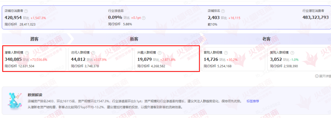 及時(shí)處理退款售后,加快物流和發(fā)貨攬收速度,提升店鋪DSR評分。針對用戶消費(fèi)情緒,火蝠電商更是做好了店鋪用戶體驗(yàn)管理舉措,及時(shí)做好安撫,適當(dāng)折扣讓利,減少差評和“問大家”板塊等負(fù)面內(nèi)容的影響。截至十月下旬,品牌店鋪潛/新客資產(chǎn)結(jié)構(gòu)得到明顯優(yōu)化。潛客人群規(guī)模超過34萬,店鋪總消費(fèi)人次超過42萬。