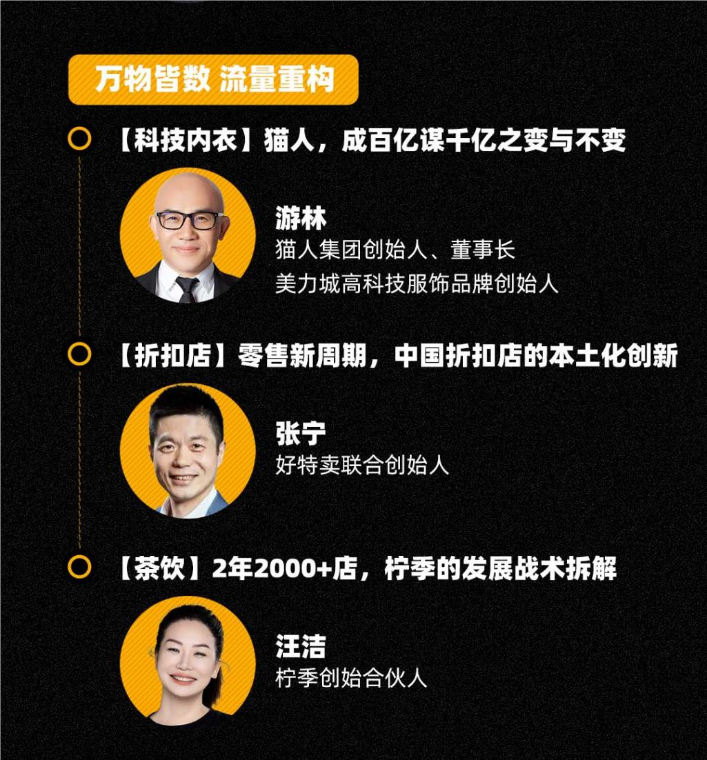 在“萬店連鎖·零售復(fù)興”維度,面向零售新時(shí)代,如何打破品牌增長瓶頸?紅杉中國合伙人蘇凱將帶來年度思考。同時(shí),a1零食研究所創(chuàng)始人兼CEO周煒平、一知合伙人&首席運(yùn)營官陳樂、白小T創(chuàng)始人張勇和三只羊集團(tuán)CEO杜剛等人,則通過零食、AI、服裝、直播等行業(yè)賽道分享零售復(fù)興之路。