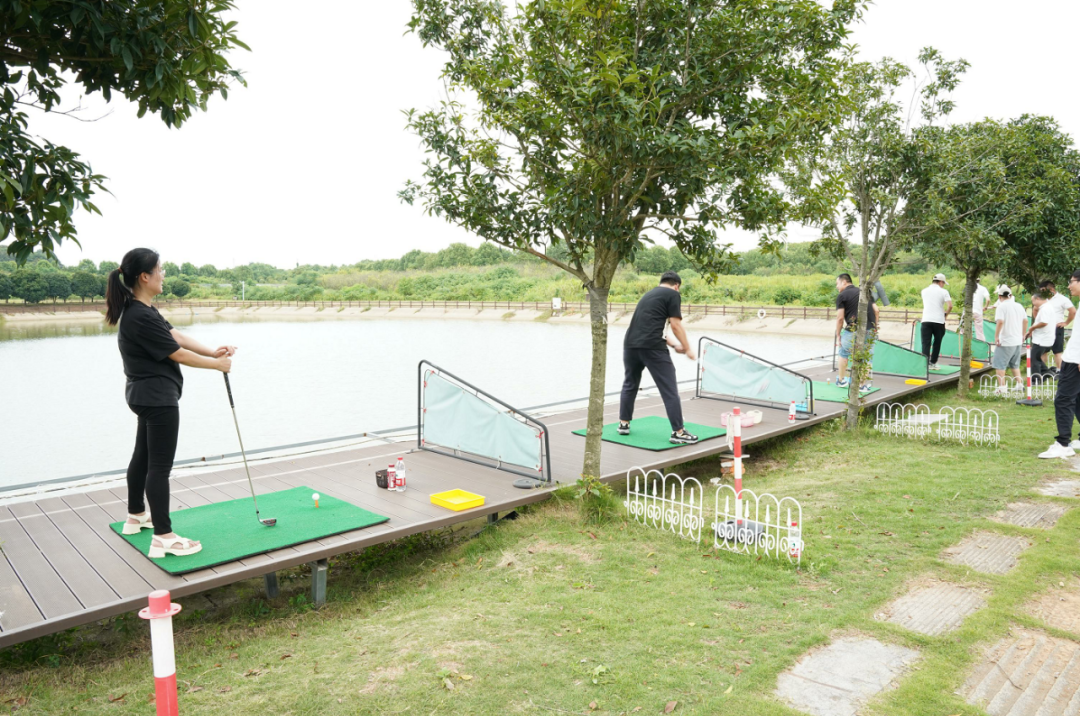與草地練習(xí)場揮桿的感覺完全不一樣!揮桿,擊球,球在空中劃過一段優(yōu)美的弧線后,掉落在碧波蕩漾的湖中泛起層層漣漪,溫柔的霧霾藍(lán)水天相接。